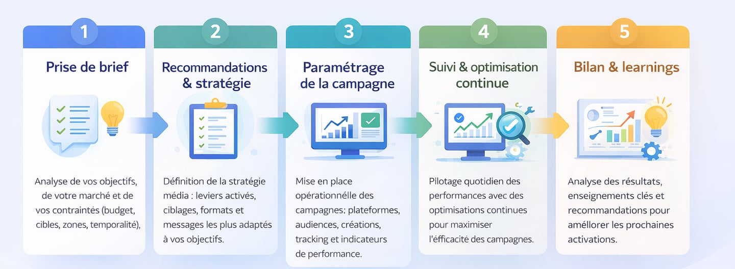 Notre approche repose sur une méthodologie structurée pour piloter vos campagnes programmatiques de manière efficace, de la définition des objectifs à l’analyse des résultats.