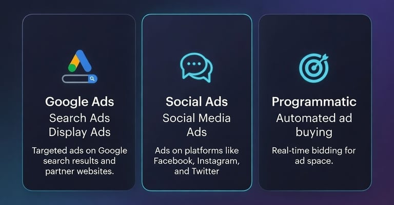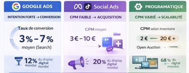 En 2026, la performance publicitaire ne repose plus sur un seul levier mais sur une orchestration intelligente des canaux. Google Ads reste incontournable pour capter la demande, les Social Ads pour générer l’attention et l’acquisition, et la programmatique pour la couverture omnicanale, la data et la scalabilité.