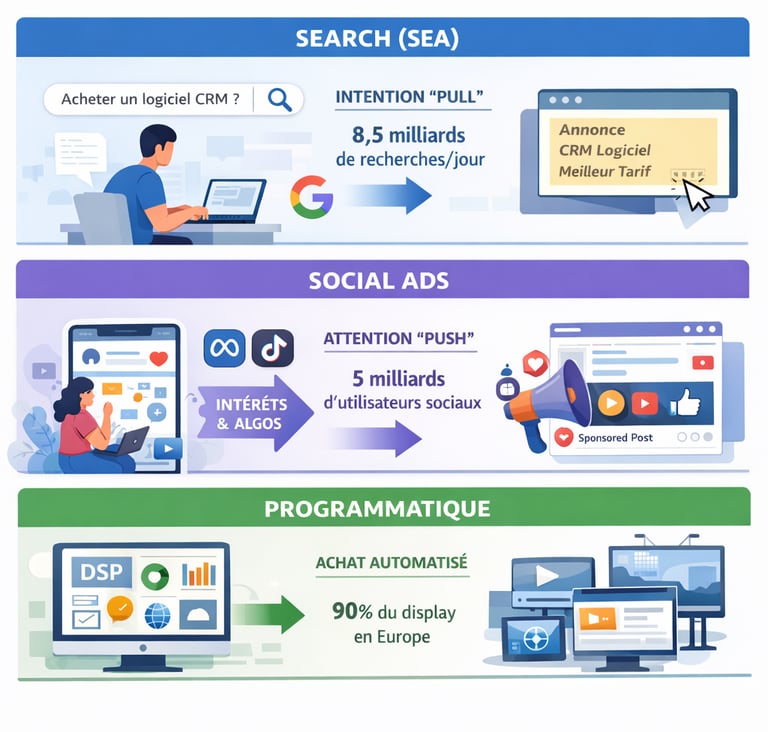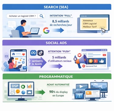 Dans l’écosystème de la publicité digitale, trois grands leviers dominent les stratégies d’acquisition : le SEA (Google Ads, Bing), les Social Ads (Meta, TikTok, LinkedIn…) et la publicité programmatique.