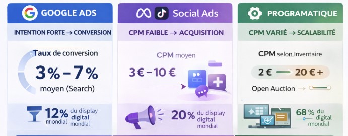 Cette complémentarité permet de construire une stratégie d’achat média cohérente, du branding à la conversion.